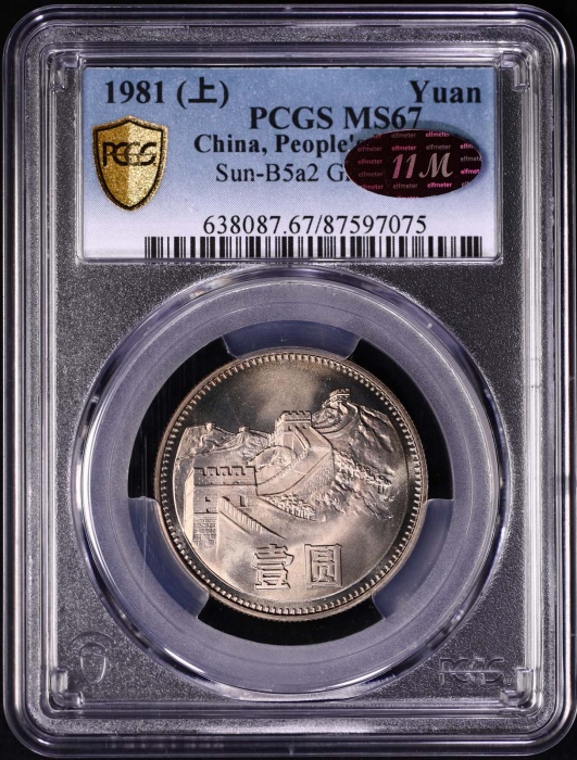 第200106号:1981年普制长城1元 PCGS MS67(上海版 11M绿标),原始光泽,黄色包浆。估价:6000--10000