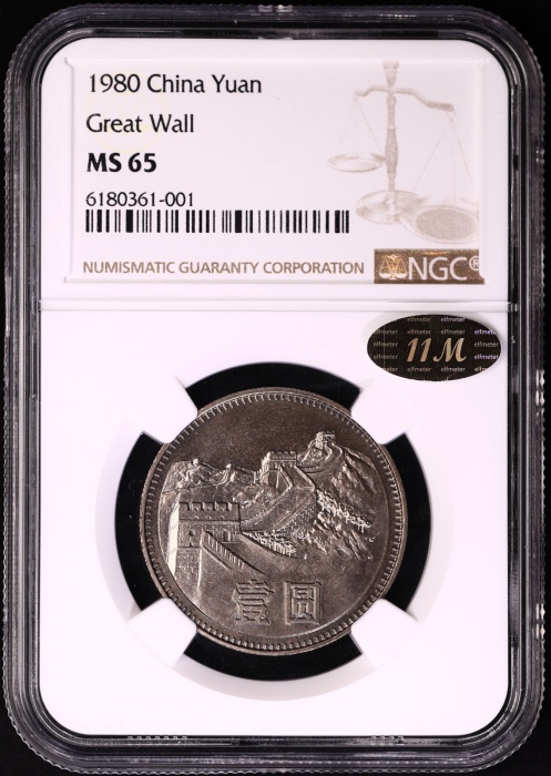 第200064号:1980年普制长城1元 NGC MS64(有砖版 11M金标),铁灰包浆,底板优秀。估价:2000--3000