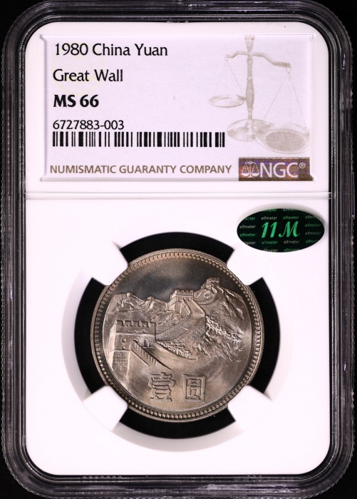 第200061号:1980年普制长城1元 NGC MS65(有砖版 老标 11M绿标),估价:2000--3500