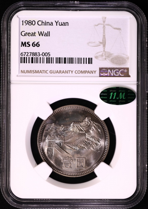 第200057号:1980年普制长城1元 NGC MS66(有砖版),原始光泽,底板细腻。估价:2000--4000