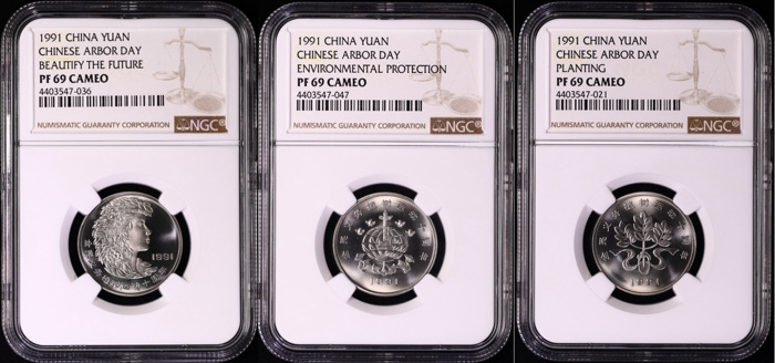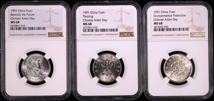 第200693号:1991年植树节工作币 NGC MS67/67/66,串号连续。产量16000套,附带原包装,少量留入民间。估价:10000--16000