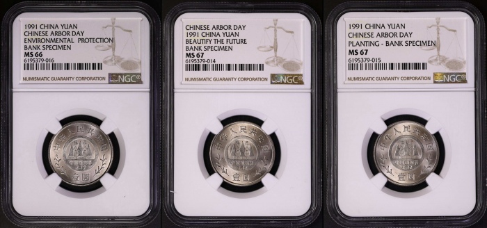 第200692号:1991年植树节工作币 NGC MS67/67/66,串号连续。产量16000套,无原包装,少量留入民间。估价:10000--16000