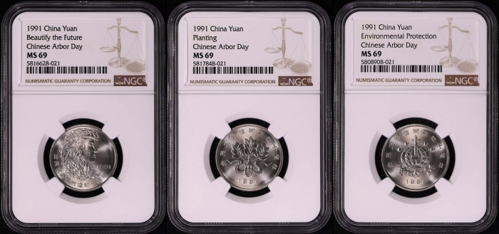 第200693号:1991年植树节工作币 NGC MS67/67/66,串号连续。产量16000套,附带原包装,少量留入民间。估价:10000--16000