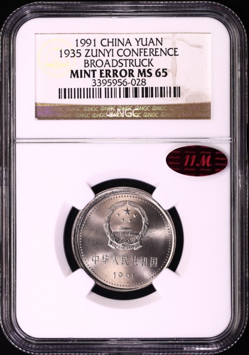 第200683号:1991年建党普制币-遵义会议 NGC MINT ERROR MS65(老标 11M红标),压印时没有模圈,因此币的延展范围超出正常压印时的范围,并且无边齿。同时拍品包含一枚正常压印的钱币一以作对比。待估 ...