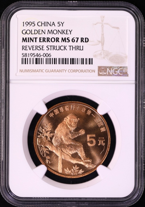 第200727号:1995年金丝猴普制币 NGC MINT ERROR MS67RD,正面面值下方线头痕待估