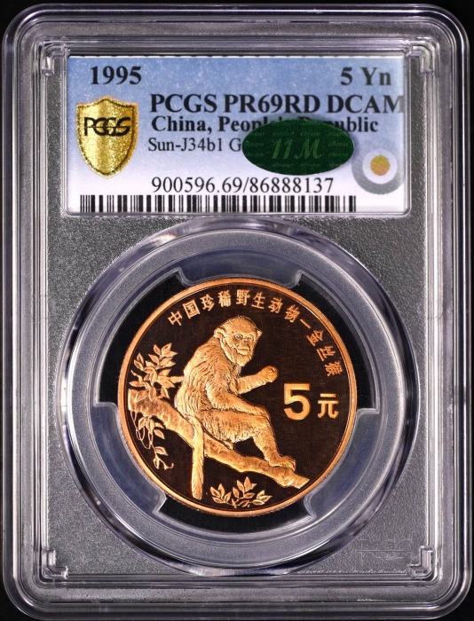第200730号:1995年金丝猴精制币 PCGS PR69RDDC,网站原状态送评,在网站首页可以查询编号进行验证,也可以查询原状态送评数量报告。原始光泽,镜面黑亮通透。估价:4500--7000
