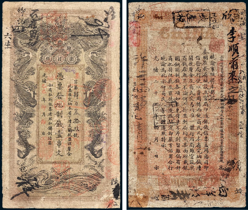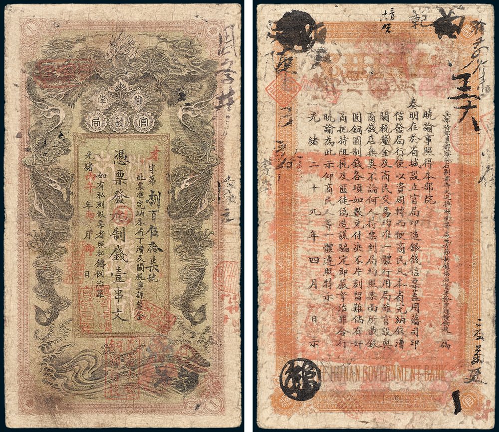 编号:才字第八百五十七号<br>加盖:湖南长沙官钱局章、兑当十紫铜圆百枚,正背有签字印章图记多处<br>品相:七五成新