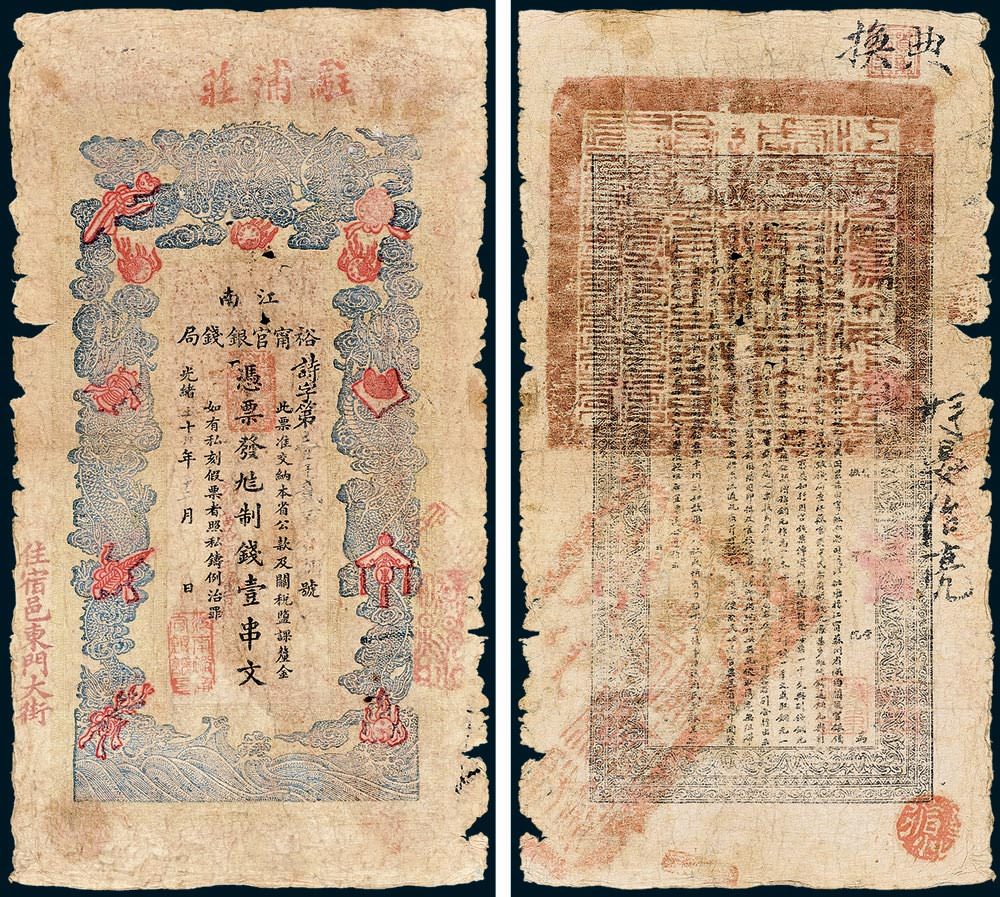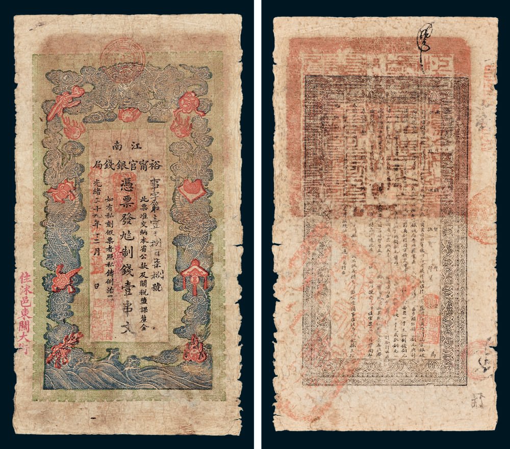 编号:事字第一千八百七八号<br>加盖:现奉局宪示此票归江北一律通用、住沭邑东关大街<br>背印、背书:江南江淮扬徐海通等处承宣布政使司之印、裕宁官银钱局关防、两江总督部堂江苏巡抚部院宪示公告<br>品相:边纸有损,七成至七五成新 ...