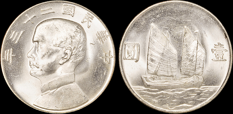 1934民国23年孙中山像背帆船壹圆银币,PCGS 87076123 MS63 ,3.89*0.24cm,27g