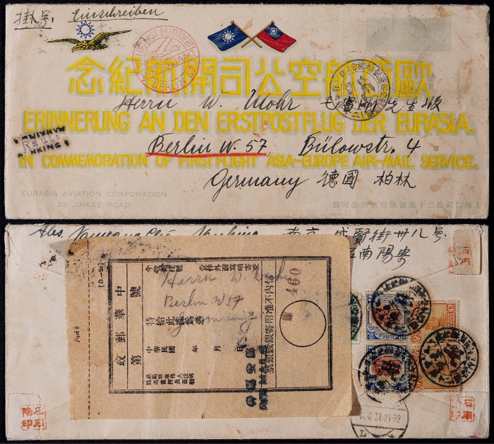 1931年南京寄德国首航挂号封,欧亚航空公司盖钢印纪念封,背贴伦敦版帆船50分一枚、1分及2元各两枚,计邮资4.52元,销“南京五月三十一日国际航空邮运创办纪念”戳,中转盖满洲里六月一日首航纪念戳,落地德国柏林6月12日到戳,封贴有中华邮政完整挂号条,并盖“航空邮件”中 ...