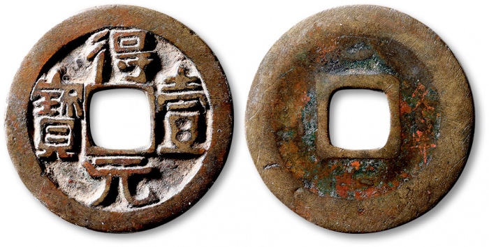 CHU: Qian Feng, 925-951, iron 10 cash, H-15.63, qian feng quán bao, with ce above on reverse, Fine to VF. According to the histories, because there was much lead and iron in Hunan, Ma Yin took the advice of his minister Gao Yu to cast lead and iron coins ...