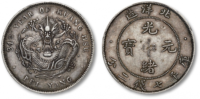 清光绪34年北洋造光绪元宝库平七钱二分银币一枚,整体清晰,灰色老包浆,状态自然,金盾PCGS XF45(88102163)