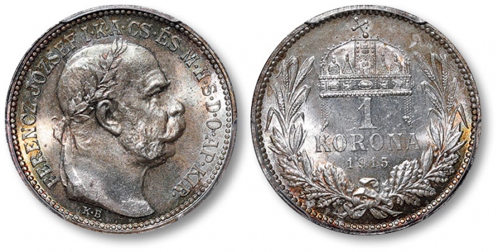 奥匈·匈牙利1915年皇帝“弗朗茨约瑟夫一世像”1科罗纳银币一枚,打制规范深峻,浮雕感强烈,细节分明,五彩包浆,底光丝滑柔亮,状态一流,品相顶级,金盾PCGS MS66(80967229)为此公司此品种仅六枚之第一名分数 ...