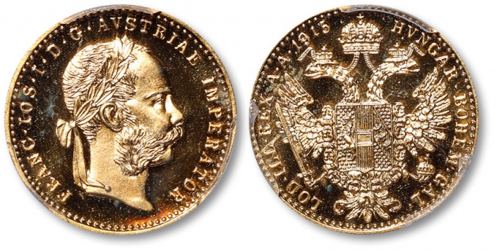 奥匈·奥地利1915年皇帝“弗朗茨约瑟夫一世像”达克特金币一枚,后铸,金盾PCGS MS68+CAM(80707088)