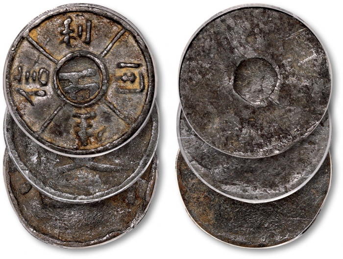 民国“信用生利”、“五文”等代用镴币共三枚,状态自然,公博 XF40、XF45(1910011204-206)