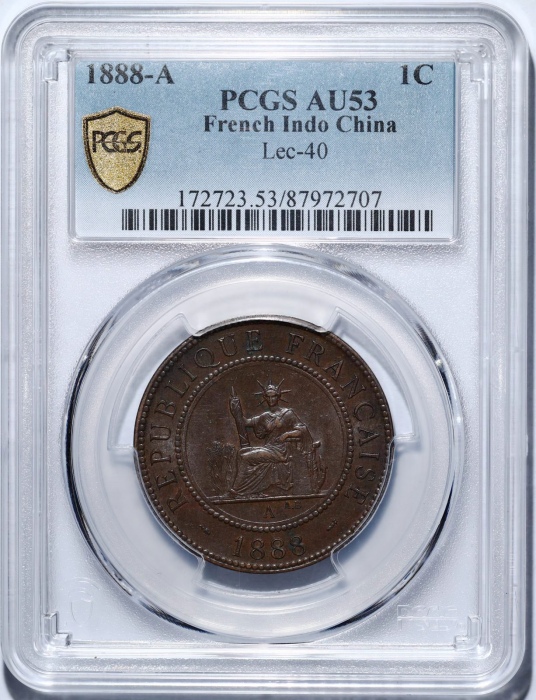 第200419号:1888年法属印度支那百分之一铜币 PCGS AU53,巧克力包浆,高点略有磨损。估价:500--1000