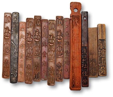 清末民国铜筹、竹筹等待用筹码一组十三枚,包括:遥观巷龙纹二角、石记大洋一角、财神图壹角、聚新春伍分等,品种丰富,长短不一,品相各异,极美品,敬请预览