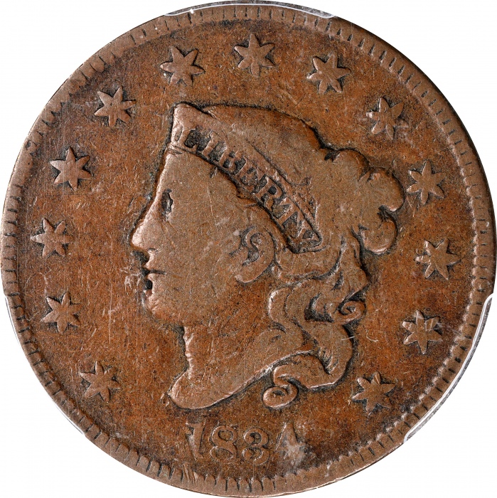 1834 Matron Head Cent. N-7. Rarity-7. Large 8, Stars and Reverse Letters. Proof-10 BN (PCGS). A legendary large cent rarity, the proof-only 1834 N-7 variety is the absolute key to a set of Matron Head cents by Newcomb number and there are just eight exampl ...