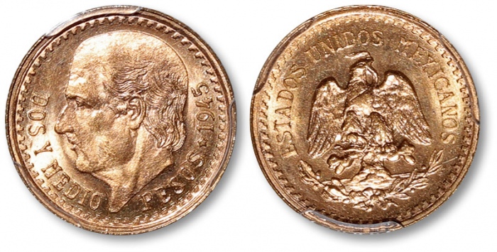 墨西哥1945年2-1/2比索铜币一枚,金盾PCGS MS67(85925420)