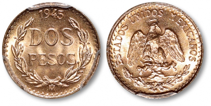 墨西哥1945年2比索铜币一枚,后铸,金盾PCGS MS67(86288056)