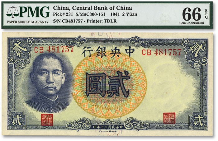 民国三十年(1941年)中央银行德纳罗版“孔林图”贰圆,左右号码字体不同之错版券,左边号码为版式山顶“7”,罕见,状态极佳,全新(季军分)