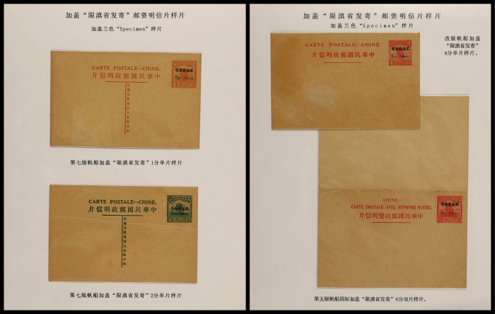 第五版及七版帆船邮资明信片加盖“限滇省发寄”样片4件,各片邮资图分加盖蓝色“specimen”样片,含七版帆船1分单片及2分单片(有软折)、改版帆船4分国际单片及五版帆船6分国际双片,较少见品,带展页 ...