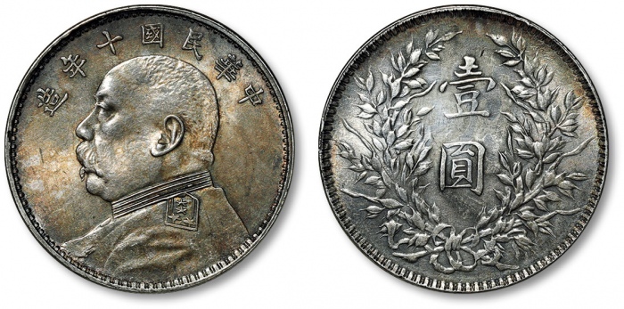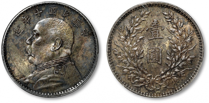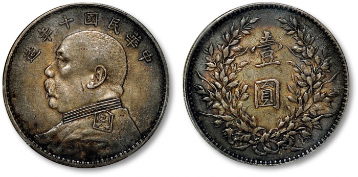 民国十年袁世凯像壹圆银币一枚,打制规范清晰,深五彩老包浆,带底光,金盾PCGS AU50(87568442)