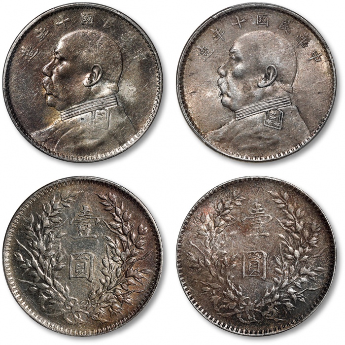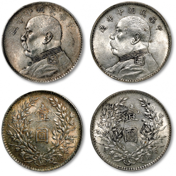 民国十年袁世凯像壹圆银币共二枚,打制规范清晰,金色包浆,原色银光,分别为金盾PCGS AU、UNC Detail(88103022、88103015)