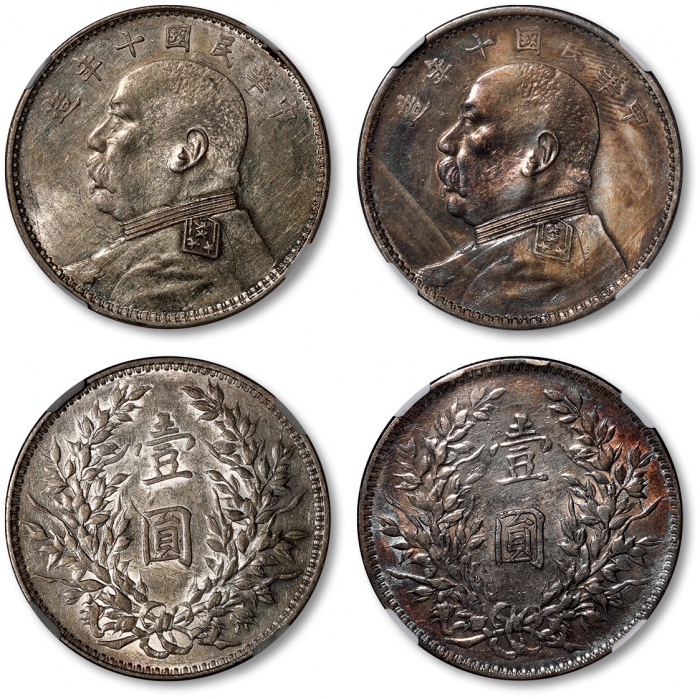 民国十年袁世凯像壹圆银币共二枚,打制规范清晰,深五彩包浆及淡金色包浆,底光柔亮,海外资深藏家出品,分别为NGC AU Detail、AU55(5787535-009、5784922-015)