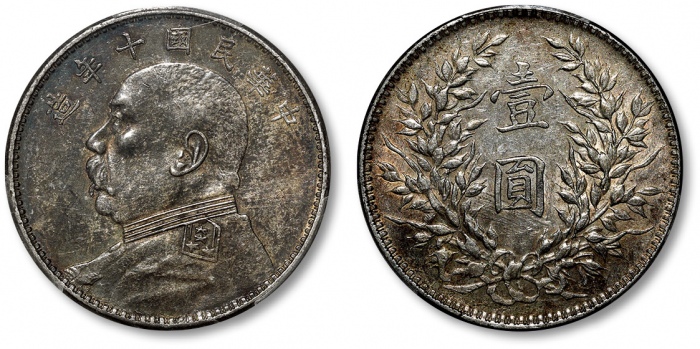 民国十年袁世凯像壹圆银币一枚,打制规范清晰,底版平整,原味上海弄堂酱彩包浆,底光柔亮,状态上佳,金盾PCGS MS61(87568445)