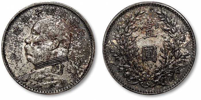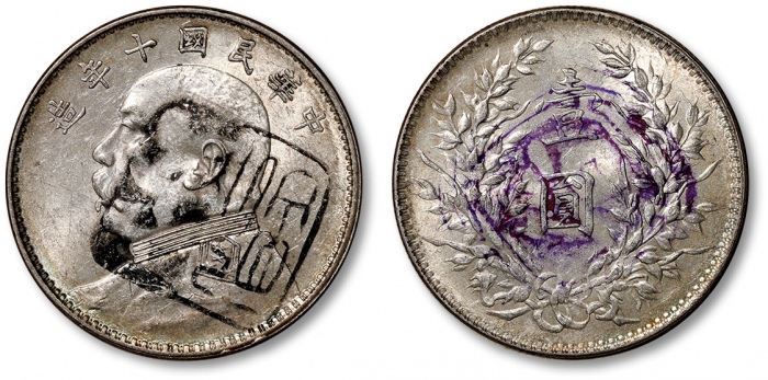 民国十年袁世凯像壹圆银币一枚,打制规范,轻薄灰色包浆,底光旋转柔滑,带“安记”及“晋”字墨戳,近未使用品