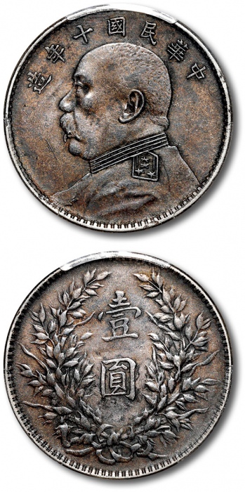 民国十年袁世凯像壹圆银币一枚,打制规范清晰,底版平整,原味上海弄堂酱彩包浆,底光柔亮,状态上佳,金盾PCGS AU50(87568440)