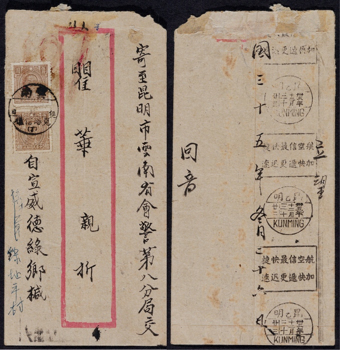 1946年云南宣威寄昆明手填戳封,红框封贴重庆中华版孙中山像50元两枚,平信邮资100元销“云南兔场信柜 年 月 日”三格手填日戳,落地背机盖昆明12月30日邮务宣传到达戳,极清少见,保存完好