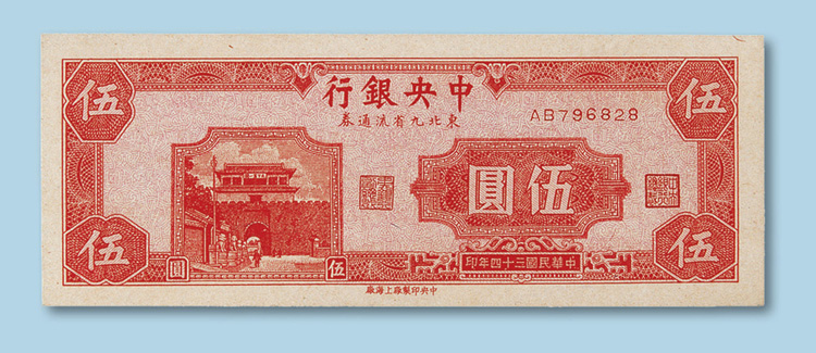 关于民国三十四年(1945年)中央银行东北九省流通券(上海厂印)伍圆一枚的评论