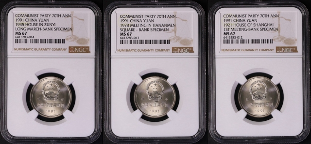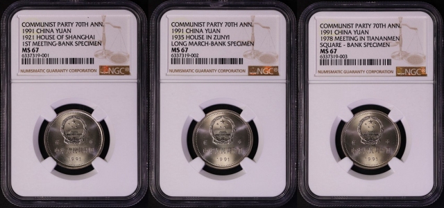 1991年建党普制工作币 NGC MS67,串号连续。产量16000套,无原包装,少量留入民间。估价:10000--20000