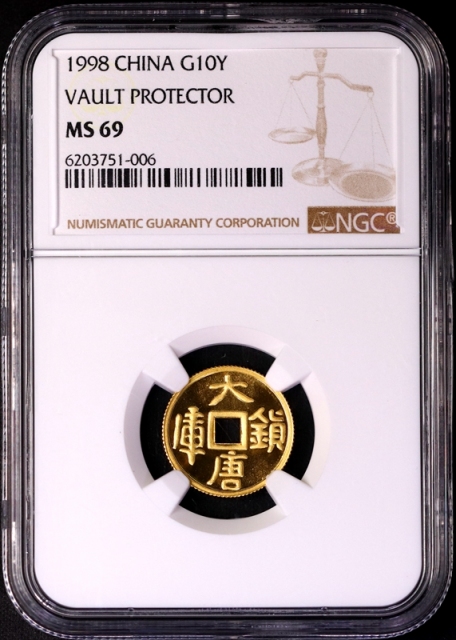 1998年1/10盎司大唐镇库金币 NGC MS69,发行量:6万。色泽金黄,状态优秀。附带证书,证书号码:56794。无包装估价:1500--2000