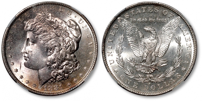 美国1881年1美元摩根银币一枚,打制规范,图案细节清晰分明,浮雕感强烈,淡金色包浆,旋转底光,丝滑闪亮,状态上佳,CNCS MS64(100025571)